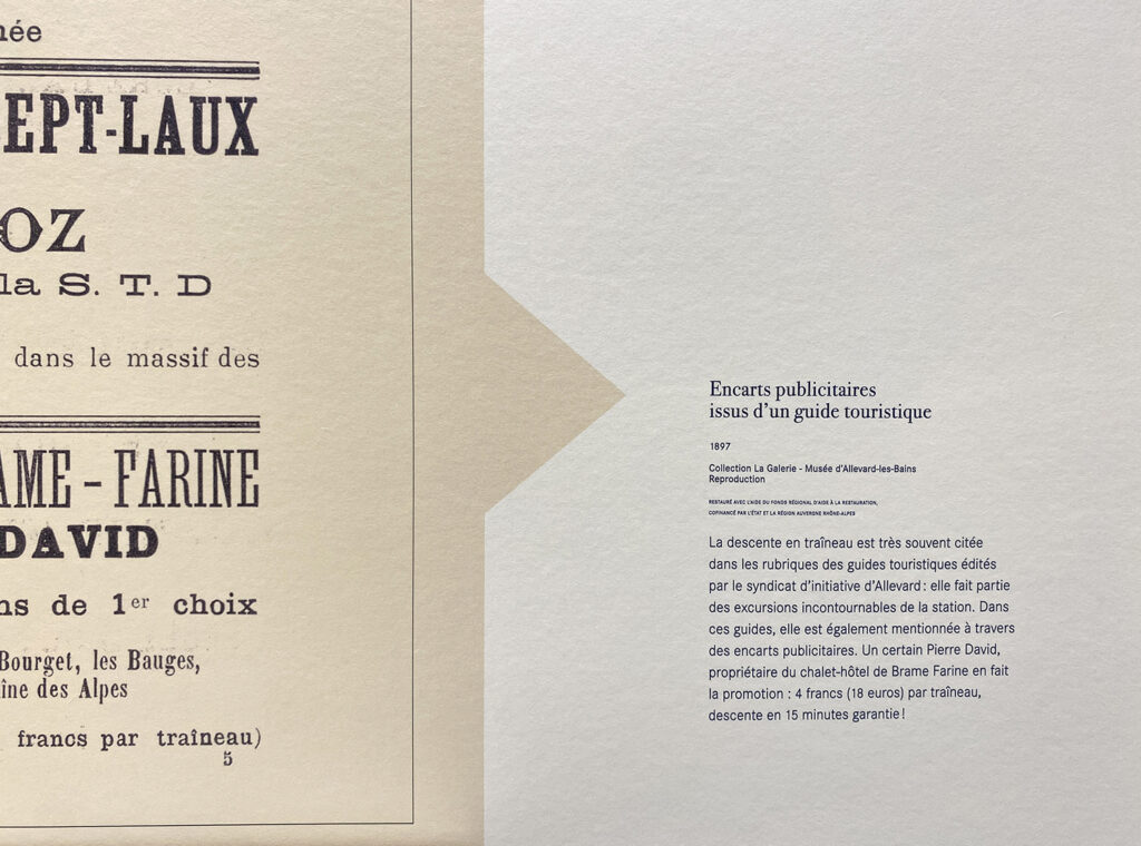 À Allevard-les-Bains, l’exposition Coup de Pub retrace l’histoire thermale de la station à travers ses objets publicitaires, au sein d’un espace récemment réhabilité. La scénographie et le graphisme s’appuient sur une palette de couleurs vives et des dispositifs rythmiques (arches, bannières, photomontage), créant une identité visuelle immersive et dynamique.